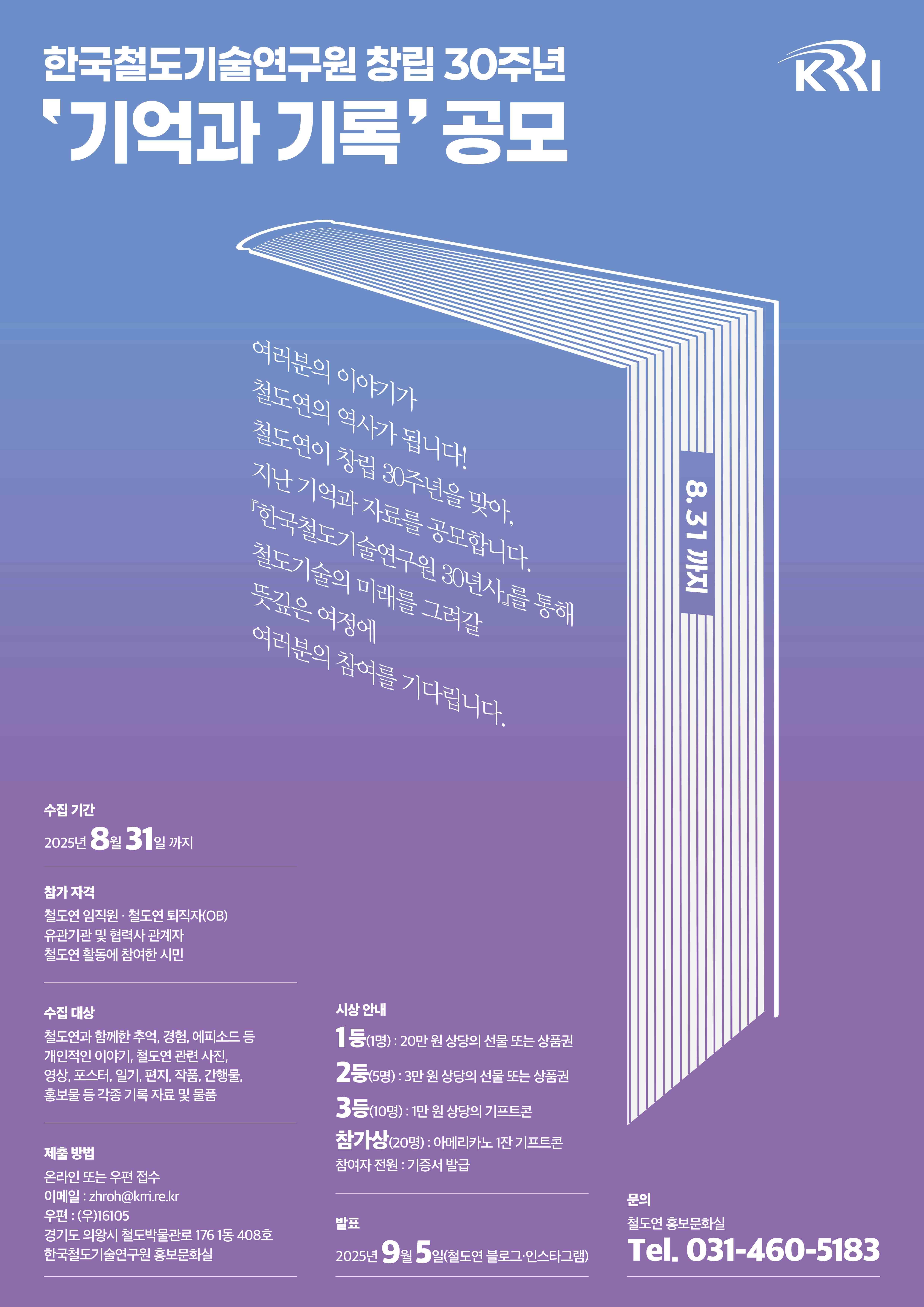 한국철도기술연구원 창립 30주년을 맞아, 철도와 함께한 소중한 추억과 경험, 에피소드 등을 공유하는 ‘기억과 기록’ 공모전을 개최합니다.