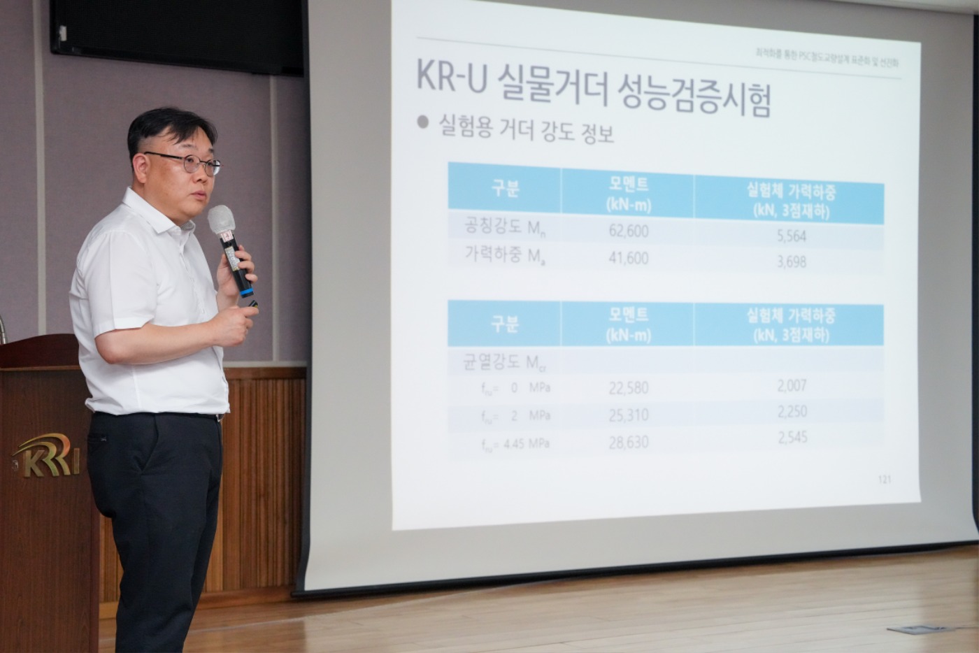 KR-U 거더 45m 길이의 실물을 대상으로 구조 안전성 등 성능을 확인했다. 국가철도공단, 철도교량 설계사 및 시공사, 관련 연구진 등 철도교량 분야 전문가 약 80여 명이 참석했다.